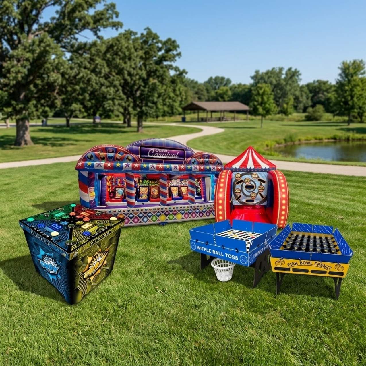 The Carnival Case Game Package is the highest-value carnival game booking in the Naperville catalog. Delivers 10-plus individual game stations in a single booking — sized for school fairs, corporate family days, and large block parties across DuPage and Will County. Book through jumpguy.com.